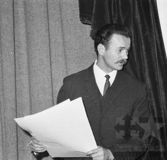 AZONOSÍTÓ: THM-BJ-00714 Férfi beszédet mond. [A szocialista brigádmozgalom szovjet mintára az 1950-es évek végén kezdett kibontakozni Magyarországon, és rendszerváltoztatáskor szűnt meg. Kezdetben csak az ipari üzemekben és gyárakban alakultak meg a brigádok, majd az agráriumban és a hivatali szférában is létrejöttek. A mozgalom jelszava: „Szocialista módon dolgozni, tanulni és élni” volt.] HELYSZÍN: Szekszárd, Tolna megye DÁTUM: 1977 FOTÓS: Bakó Jenő