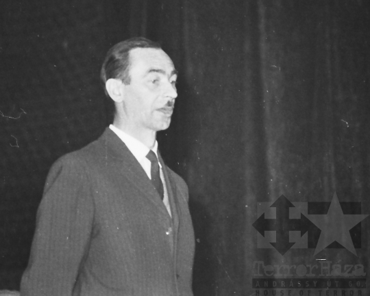 AZONOSÍTÓ: THM-BJ-00717 Férfi beszédet mond - transzparensen felirat: "Munkánk minőségének és hatékonyságának javításával, többletvállalásokkal készülünk a NAGY OKT. SZOC. FORR. 60. évfordulójára". [Az októberi orosz forradalom (kommunista propagandában: nagy októberi szocialista forradalom) 1917. november 6–12. (október 24–30.) között zajlott, amelynek során a bolsevikok a Téli Palota ostroma után az ott székelő Ideiglenes Kormány tagjait letartóztatták, és Lenin vezetésével, akit a Népbiztosok Tanácsa elnökévé választottak, puccsal átvették a hatalmat. Hazánkban ez a nap 1950-től 1989-ig pártállami ünnep volt.] [A szocialista brigádmozgalom szovjet mintára az 1950-es évek végén kezdett kibontakozni Magyarországon, és rendszerváltoztatáskor szűnt meg. Kezdetben csak az ipari üzemekben és gyárakban alakultak meg a brigádok, majd az agráriumban és a hivatali szférában is létrejöttek. A mozgalom jelszava: „Szocialista módon dolgozni, tanulni és élni” volt.] HELYSZÍN: Szekszárd, Tolna megye DÁTUM: 1977 FOTÓS: Bakó Jenő