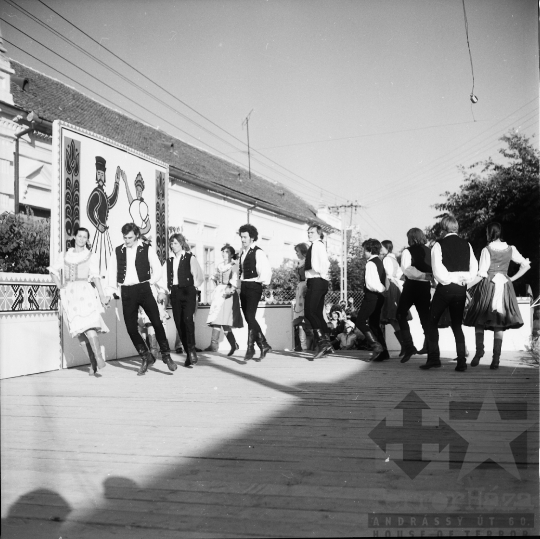 AZONOSÍTÓ: THM-BJ-00718 Néptánc produkció a színpadon - transzparenseken feliratok: "Hatékonyabb munkával a XI. pártkongresszus határozatainak következetes végrehajtásáért" "Munkánk minőségének és hatékonyságának javításával, többletvállalásokkal készülünk a NAGY OKT. SZOC. FORR. 60. évfordulójára". [Az októberi orosz forradalom (kommunista propagandában: nagy októberi szocialista forradalom) 1917. november 6–12. (október 24–30.) között zajlott, amelynek során a bolsevikok a Téli Palota ostroma után az ott székelő Ideiglenes Kormány tagjait letartóztatták, és Lenin vezetésével, akit a Népbiztosok Tanácsa elnökévé választottak, puccsal átvették a hatalmat. Hazánkban ez a nap 1950-től 1989-ig pártállami ünnep volt.] [A szocialista brigádmozgalom szovjet mintára az 1950-es évek végén kezdett kibontakozni Magyarországon, és rendszerváltoztatáskor szűnt meg. Kezdetben csak az ipari üzemekben és gyárakban alakultak meg a brigádok, majd az agráriumban és a hivatali szférában is létrejöttek. A mozgalom jelszava: „Szocialista módon dolgozni, tanulni és élni” volt.] HELYSZÍN: Szekszárd, Tolna megye DÁTUM: 1977 FOTÓS: Bakó Jenő