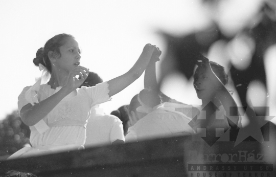 AZONOSÍTÓ: THM-BJ-00718 Néptánc produkció a színpadon - transzparenseken feliratok: "Hatékonyabb munkával a XI. pártkongresszus határozatainak következetes végrehajtásáért" "Munkánk minőségének és hatékonyságának javításával, többletvállalásokkal készülünk a NAGY OKT. SZOC. FORR. 60. évfordulójára". [Az októberi orosz forradalom (kommunista propagandában: nagy októberi szocialista forradalom) 1917. november 6–12. (október 24–30.) között zajlott, amelynek során a bolsevikok a Téli Palota ostroma után az ott székelő Ideiglenes Kormány tagjait letartóztatták, és Lenin vezetésével, akit a Népbiztosok Tanácsa elnökévé választottak, puccsal átvették a hatalmat. Hazánkban ez a nap 1950-től 1989-ig pártállami ünnep volt.] [A szocialista brigádmozgalom szovjet mintára az 1950-es évek végén kezdett kibontakozni Magyarországon, és rendszerváltoztatáskor szűnt meg. Kezdetben csak az ipari üzemekben és gyárakban alakultak meg a brigádok, majd az agráriumban és a hivatali szférában is létrejöttek. A mozgalom jelszava: „Szocialista módon dolgozni, tanulni és élni” volt.] HELYSZÍN: Szekszárd, Tolna megye DÁTUM: 1977 FOTÓS: Bakó Jenő