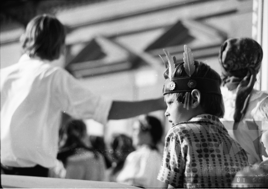 AZONOSÍTÓ: THM-BJ-00718 Néptánc produkció a színpadon - transzparenseken feliratok: "Hatékonyabb munkával a XI. pártkongresszus határozatainak következetes végrehajtásáért" "Munkánk minőségének és hatékonyságának javításával, többletvállalásokkal készülünk a NAGY OKT. SZOC. FORR. 60. évfordulójára". [Az októberi orosz forradalom (kommunista propagandában: nagy októberi szocialista forradalom) 1917. november 6–12. (október 24–30.) között zajlott, amelynek során a bolsevikok a Téli Palota ostroma után az ott székelő Ideiglenes Kormány tagjait letartóztatták, és Lenin vezetésével, akit a Népbiztosok Tanácsa elnökévé választottak, puccsal átvették a hatalmat. Hazánkban ez a nap 1950-től 1989-ig pártállami ünnep volt.] [A szocialista brigádmozgalom szovjet mintára az 1950-es évek végén kezdett kibontakozni Magyarországon, és rendszerváltoztatáskor szűnt meg. Kezdetben csak az ipari üzemekben és gyárakban alakultak meg a brigádok, majd az agráriumban és a hivatali szférában is létrejöttek. A mozgalom jelszava: „Szocialista módon dolgozni, tanulni és élni” volt.] HELYSZÍN: Szekszárd, Tolna megye DÁTUM: 1977 FOTÓS: Bakó Jenő