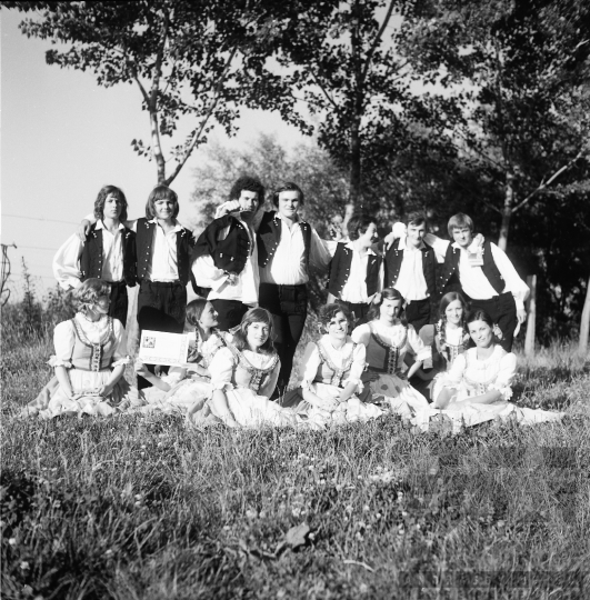 AZONOSÍTÓ: THM-BJ-00718 Néptánc produkció a színpadon - transzparenseken feliratok: "Hatékonyabb munkával a XI. pártkongresszus határozatainak következetes végrehajtásáért" "Munkánk minőségének és hatékonyságának javításával, többletvállalásokkal készülünk a NAGY OKT. SZOC. FORR. 60. évfordulójára". [Az októberi orosz forradalom (kommunista propagandában: nagy októberi szocialista forradalom) 1917. november 6–12. (október 24–30.) között zajlott, amelynek során a bolsevikok a Téli Palota ostroma után az ott székelő Ideiglenes Kormány tagjait letartóztatták, és Lenin vezetésével, akit a Népbiztosok Tanácsa elnökévé választottak, puccsal átvették a hatalmat. Hazánkban ez a nap 1950-től 1989-ig pártállami ünnep volt.] [A szocialista brigádmozgalom szovjet mintára az 1950-es évek végén kezdett kibontakozni Magyarországon, és rendszerváltoztatáskor szűnt meg. Kezdetben csak az ipari üzemekben és gyárakban alakultak meg a brigádok, majd az agráriumban és a hivatali szférában is létrejöttek. A mozgalom jelszava: „Szocialista módon dolgozni, tanulni és élni” volt.] HELYSZÍN: Szekszárd, Tolna megye DÁTUM: 1977 FOTÓS: Bakó Jenő