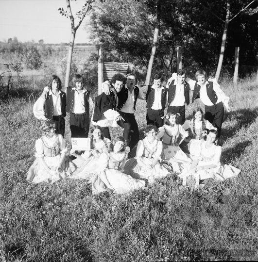 AZONOSÍTÓ: THM-BJ-00718 Néptánc produkció a színpadon - transzparenseken feliratok: "Hatékonyabb munkával a XI. pártkongresszus határozatainak következetes végrehajtásáért" "Munkánk minőségének és hatékonyságának javításával, többletvállalásokkal készülünk a NAGY OKT. SZOC. FORR. 60. évfordulójára". [Az októberi orosz forradalom (kommunista propagandában: nagy októberi szocialista forradalom) 1917. november 6–12. (október 24–30.) között zajlott, amelynek során a bolsevikok a Téli Palota ostroma után az ott székelő Ideiglenes Kormány tagjait letartóztatták, és Lenin vezetésével, akit a Népbiztosok Tanácsa elnökévé választottak, puccsal átvették a hatalmat. Hazánkban ez a nap 1950-től 1989-ig pártállami ünnep volt.] [A szocialista brigádmozgalom szovjet mintára az 1950-es évek végén kezdett kibontakozni Magyarországon, és rendszerváltoztatáskor szűnt meg. Kezdetben csak az ipari üzemekben és gyárakban alakultak meg a brigádok, majd az agráriumban és a hivatali szférában is létrejöttek. A mozgalom jelszava: „Szocialista módon dolgozni, tanulni és élni” volt.] HELYSZÍN: Szekszárd, Tolna megye DÁTUM: 1977 FOTÓS: Bakó Jenő