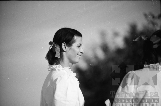 AZONOSÍTÓ: THM-BJ-00718 Néptánc produkció a színpadon - transzparenseken feliratok: "Hatékonyabb munkával a XI. pártkongresszus határozatainak következetes végrehajtásáért" "Munkánk minőségének és hatékonyságának javításával, többletvállalásokkal készülünk a NAGY OKT. SZOC. FORR. 60. évfordulójára". [Az októberi orosz forradalom (kommunista propagandában: nagy októberi szocialista forradalom) 1917. november 6–12. (október 24–30.) között zajlott, amelynek során a bolsevikok a Téli Palota ostroma után az ott székelő Ideiglenes Kormány tagjait letartóztatták, és Lenin vezetésével, akit a Népbiztosok Tanácsa elnökévé választottak, puccsal átvették a hatalmat. Hazánkban ez a nap 1950-től 1989-ig pártállami ünnep volt.] [A szocialista brigádmozgalom szovjet mintára az 1950-es évek végén kezdett kibontakozni Magyarországon, és rendszerváltoztatáskor szűnt meg. Kezdetben csak az ipari üzemekben és gyárakban alakultak meg a brigádok, majd az agráriumban és a hivatali szférában is létrejöttek. A mozgalom jelszava: „Szocialista módon dolgozni, tanulni és élni” volt.] HELYSZÍN: Szekszárd, Tolna megye DÁTUM: 1977 FOTÓS: Bakó Jenő