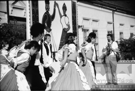 AZONOSÍTÓ: THM-BJ-00718 Néptánc produkció a színpadon - transzparenseken feliratok: "Hatékonyabb munkával a XI. pártkongresszus határozatainak következetes végrehajtásáért" "Munkánk minőségének és hatékonyságának javításával, többletvállalásokkal készülünk a NAGY OKT. SZOC. FORR. 60. évfordulójára". [Az októberi orosz forradalom (kommunista propagandában: nagy októberi szocialista forradalom) 1917. november 6–12. (október 24–30.) között zajlott, amelynek során a bolsevikok a Téli Palota ostroma után az ott székelő Ideiglenes Kormány tagjait letartóztatták, és Lenin vezetésével, akit a Népbiztosok Tanácsa elnökévé választottak, puccsal átvették a hatalmat. Hazánkban ez a nap 1950-től 1989-ig pártállami ünnep volt.] [A szocialista brigádmozgalom szovjet mintára az 1950-es évek végén kezdett kibontakozni Magyarországon, és rendszerváltoztatáskor szűnt meg. Kezdetben csak az ipari üzemekben és gyárakban alakultak meg a brigádok, majd az agráriumban és a hivatali szférában is létrejöttek. A mozgalom jelszava: „Szocialista módon dolgozni, tanulni és élni” volt.] HELYSZÍN: Szekszárd, Tolna megye DÁTUM: 1977 FOTÓS: Bakó Jenő