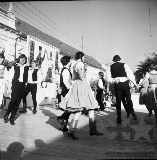 AZONOSÍTÓ: THM-BJ-00718 Néptánc produkció a színpadon - transzparenseken feliratok: "Hatékonyabb munkával a XI. pártkongresszus határozatainak következetes végrehajtásáért" "Munkánk minőségének és hatékonyságának javításával, többletvállalásokkal készülünk a NAGY OKT. SZOC. FORR. 60. évfordulójára". [Az októberi orosz forradalom (kommunista propagandában: nagy októberi szocialista forradalom) 1917. november 6–12. (október 24–30.) között zajlott, amelynek során a bolsevikok a Téli Palota ostroma után az ott székelő Ideiglenes Kormány tagjait letartóztatták, és Lenin vezetésével, akit a Népbiztosok Tanácsa elnökévé választottak, puccsal átvették a hatalmat. Hazánkban ez a nap 1950-től 1989-ig pártállami ünnep volt.] [A szocialista brigádmozgalom szovjet mintára az 1950-es évek végén kezdett kibontakozni Magyarországon, és rendszerváltoztatáskor szűnt meg. Kezdetben csak az ipari üzemekben és gyárakban alakultak meg a brigádok, majd az agráriumban és a hivatali szférában is létrejöttek. A mozgalom jelszava: „Szocialista módon dolgozni, tanulni és élni” volt.] HELYSZÍN: Szekszárd, Tolna megye DÁTUM: 1977 FOTÓS: Bakó Jenő