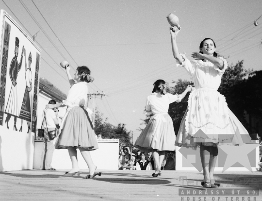 AZONOSÍTÓ: THM-BJ-00718 Néptánc produkció a színpadon - transzparenseken feliratok: "Hatékonyabb munkával a XI. pártkongresszus határozatainak következetes végrehajtásáért" "Munkánk minőségének és hatékonyságának javításával, többletvállalásokkal készülünk a NAGY OKT. SZOC. FORR. 60. évfordulójára". [Az októberi orosz forradalom (kommunista propagandában: nagy októberi szocialista forradalom) 1917. november 6–12. (október 24–30.) között zajlott, amelynek során a bolsevikok a Téli Palota ostroma után az ott székelő Ideiglenes Kormány tagjait letartóztatták, és Lenin vezetésével, akit a Népbiztosok Tanácsa elnökévé választottak, puccsal átvették a hatalmat. Hazánkban ez a nap 1950-től 1989-ig pártállami ünnep volt.] [A szocialista brigádmozgalom szovjet mintára az 1950-es évek végén kezdett kibontakozni Magyarországon, és rendszerváltoztatáskor szűnt meg. Kezdetben csak az ipari üzemekben és gyárakban alakultak meg a brigádok, majd az agráriumban és a hivatali szférában is létrejöttek. A mozgalom jelszava: „Szocialista módon dolgozni, tanulni és élni” volt.] HELYSZÍN: Szekszárd, Tolna megye DÁTUM: 1977 FOTÓS: Bakó Jenő