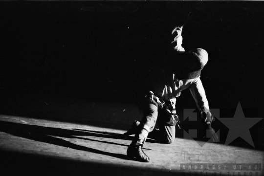 AZONOSÍTÓ: THM-BJ-00718 Néptánc produkció a színpadon - transzparenseken feliratok: "Hatékonyabb munkával a XI. pártkongresszus határozatainak következetes végrehajtásáért" "Munkánk minőségének és hatékonyságának javításával, többletvállalásokkal készülünk a NAGY OKT. SZOC. FORR. 60. évfordulójára". [Az októberi orosz forradalom (kommunista propagandában: nagy októberi szocialista forradalom) 1917. november 6–12. (október 24–30.) között zajlott, amelynek során a bolsevikok a Téli Palota ostroma után az ott székelő Ideiglenes Kormány tagjait letartóztatták, és Lenin vezetésével, akit a Népbiztosok Tanácsa elnökévé választottak, puccsal átvették a hatalmat. Hazánkban ez a nap 1950-től 1989-ig pártállami ünnep volt.] [A szocialista brigádmozgalom szovjet mintára az 1950-es évek végén kezdett kibontakozni Magyarországon, és rendszerváltoztatáskor szűnt meg. Kezdetben csak az ipari üzemekben és gyárakban alakultak meg a brigádok, majd az agráriumban és a hivatali szférában is létrejöttek. A mozgalom jelszava: „Szocialista módon dolgozni, tanulni és élni” volt.] HELYSZÍN: Szekszárd, Tolna megye DÁTUM: 1977 FOTÓS: Bakó Jenő