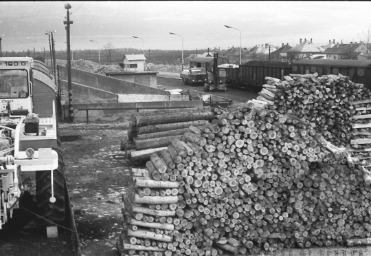 vagon vasútállomás rönkfa tehervonat szállítás munkagép szerelvény vasút teherautó IFA Nagydorog Tolna megye Magyarország 1977 Bakó JenőFotó részletei