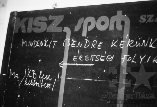 AZONOSÍTÓ: THM-BJ-00717 Férfi beszédet mond - transzparensen felirat: "Munkánk minőségének és hatékonyságának javításával, többletvállalásokkal készülünk a NAGY OKT. SZOC. FORR. 60. évfordulójára". [Az októberi orosz forradalom (kommunista propagandában: nagy októberi szocialista forradalom) 1917. november 6–12. (október 24–30.) között zajlott, amelynek során a bolsevikok a Téli Palota ostroma után az ott székelő Ideiglenes Kormány tagjait letartóztatták, és Lenin vezetésével, akit a Népbiztosok Tanácsa elnökévé választottak, puccsal átvették a hatalmat. Hazánkban ez a nap 1950-től 1989-ig pártállami ünnep volt.] [A szocialista brigádmozgalom szovjet mintára az 1950-es évek végén kezdett kibontakozni Magyarországon, és rendszerváltoztatáskor szűnt meg. Kezdetben csak az ipari üzemekben és gyárakban alakultak meg a brigádok, majd az agráriumban és a hivatali szférában is létrejöttek. A mozgalom jelszava: „Szocialista módon dolgozni, tanulni és élni” volt.] HELYSZÍN: Szekszárd, Tolna megye DÁTUM: 1977 FOTÓS: Bakó Jenő