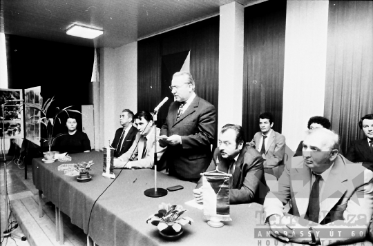 szocialista ország húsipar húskombinát delegáció gyűlés pódium beszéd zászló Kádár-címer mikrofon hamutartó pódium Szekszárd Tolna megye Magyarország 1981 Bakó JenőFotó részletei