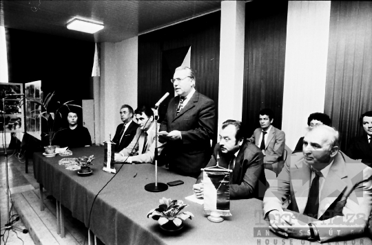 szocialista ország húsipar húskombinát delegáció gyűlés pódium beszéd zászló Kádár-címer mikrofon hamutartó pódium Szekszárd Tolna megye Magyarország 1981 Bakó JenőFotó részletei