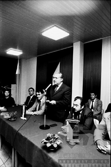 szocialista ország húsipar húskombinát delegáció gyűlés pódium beszéd zászló Kádár-címer mikrofon hamutartó pódium Szekszárd Tolna megye Magyarország 1981 Bakó JenőFotó részletei
