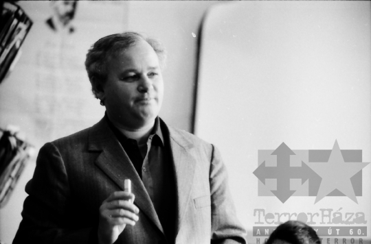 AZONOSÍTÓ: THM-BJ-00717 Férfi beszédet mond - transzparensen felirat: "Munkánk minőségének és hatékonyságának javításával, többletvállalásokkal készülünk a NAGY OKT. SZOC. FORR. 60. évfordulójára". [Az októberi orosz forradalom (kommunista propagandában: nagy októberi szocialista forradalom) 1917. november 6–12. (október 24–30.) között zajlott, amelynek során a bolsevikok a Téli Palota ostroma után az ott székelő Ideiglenes Kormány tagjait letartóztatták, és Lenin vezetésével, akit a Népbiztosok Tanácsa elnökévé választottak, puccsal átvették a hatalmat. Hazánkban ez a nap 1950-től 1989-ig pártállami ünnep volt.] [A szocialista brigádmozgalom szovjet mintára az 1950-es évek végén kezdett kibontakozni Magyarországon, és rendszerváltoztatáskor szűnt meg. Kezdetben csak az ipari üzemekben és gyárakban alakultak meg a brigádok, majd az agráriumban és a hivatali szférában is létrejöttek. A mozgalom jelszava: „Szocialista módon dolgozni, tanulni és élni” volt.] HELYSZÍN: Szekszárd, Tolna megye DÁTUM: 1977 FOTÓS: Bakó Jenő