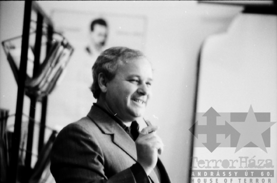 AZONOSÍTÓ: THM-BJ-00717 Férfi beszédet mond - transzparensen felirat: "Munkánk minőségének és hatékonyságának javításával, többletvállalásokkal készülünk a NAGY OKT. SZOC. FORR. 60. évfordulójára". [Az októberi orosz forradalom (kommunista propagandában: nagy októberi szocialista forradalom) 1917. november 6–12. (október 24–30.) között zajlott, amelynek során a bolsevikok a Téli Palota ostroma után az ott székelő Ideiglenes Kormány tagjait letartóztatták, és Lenin vezetésével, akit a Népbiztosok Tanácsa elnökévé választottak, puccsal átvették a hatalmat. Hazánkban ez a nap 1950-től 1989-ig pártállami ünnep volt.] [A szocialista brigádmozgalom szovjet mintára az 1950-es évek végén kezdett kibontakozni Magyarországon, és rendszerváltoztatáskor szűnt meg. Kezdetben csak az ipari üzemekben és gyárakban alakultak meg a brigádok, majd az agráriumban és a hivatali szférában is létrejöttek. A mozgalom jelszava: „Szocialista módon dolgozni, tanulni és élni” volt.] HELYSZÍN: Szekszárd, Tolna megye DÁTUM: 1977 FOTÓS: Bakó Jenő