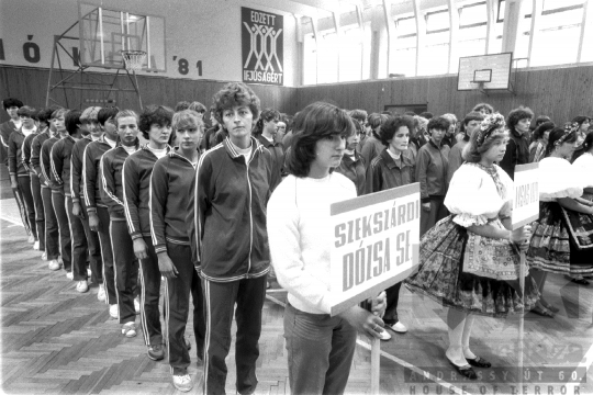 megnyitó transzparens népviselet kosárpalánk játékos pálya tréningruha csapat kosárlabda Szekszárd Tolna megye Magyarország 1981 Bakó JenőFotó részletei