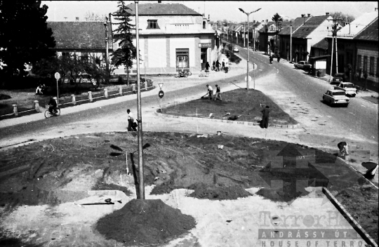 utcakép építkezés főtér KRESZ-tábla autó Trabant Lada motor Tolna Tolna megye Magyarország 1983 Bakó JenőFotó részletei