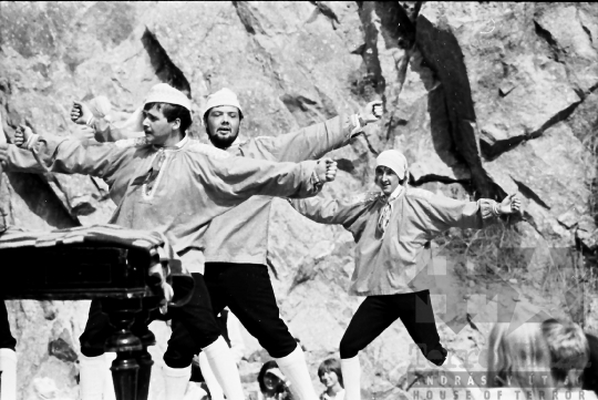 AZONOSÍTÓ: THM-BJ-00718 Néptánc produkció a színpadon - transzparenseken feliratok: "Hatékonyabb munkával a XI. pártkongresszus határozatainak következetes végrehajtásáért" "Munkánk minőségének és hatékonyságának javításával, többletvállalásokkal készülünk a NAGY OKT. SZOC. FORR. 60. évfordulójára". [Az októberi orosz forradalom (kommunista propagandában: nagy októberi szocialista forradalom) 1917. november 6–12. (október 24–30.) között zajlott, amelynek során a bolsevikok a Téli Palota ostroma után az ott székelő Ideiglenes Kormány tagjait letartóztatták, és Lenin vezetésével, akit a Népbiztosok Tanácsa elnökévé választottak, puccsal átvették a hatalmat. Hazánkban ez a nap 1950-től 1989-ig pártállami ünnep volt.] [A szocialista brigádmozgalom szovjet mintára az 1950-es évek végén kezdett kibontakozni Magyarországon, és rendszerváltoztatáskor szűnt meg. Kezdetben csak az ipari üzemekben és gyárakban alakultak meg a brigádok, majd az agráriumban és a hivatali szférában is létrejöttek. A mozgalom jelszava: „Szocialista módon dolgozni, tanulni és élni” volt.] HELYSZÍN: Szekszárd, Tolna megye DÁTUM: 1977 FOTÓS: Bakó Jenő