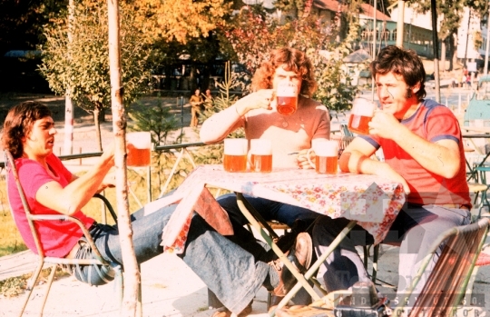 kirándulás sör korsó kempingasztal trapéznadrág Erdély Románia 1975 Bakó JenőFotó részletei