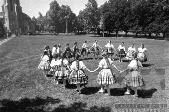 néprajz néptánc népviselet előadás park templom Decs Tolna megye Magyarország 1980 Bakó JenőFotó részletei