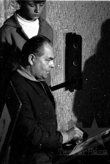 AZONOSÍTÓ: THM-BJ-00740 Zenészek asztal mellett játszanak. [TOTÉV: Tolna megyei Tatarozó és Építő Vállalat 1950. október végén a megyeszerte működő kisipari szövetkezetek összevonásával alakult meg, 1968 közepére szocialista középvállalattá nőtte ki magát Tm. Tanácsi Építőipari Vállalat néven.] HELYSZÍN: Szekszárd, Tolna megye DÁTUM: 1977 FOTÓS: Bakó Jenő