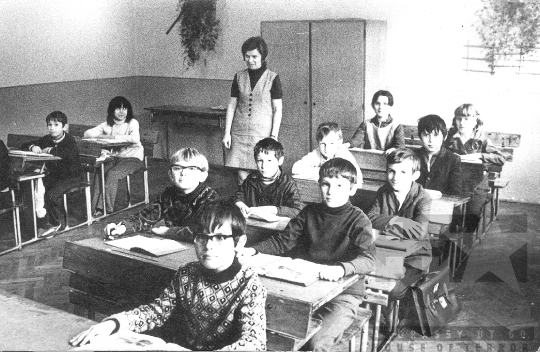 iskola általános iskola tanterem diák iskolapad iskolatáska tanár Mórágy Tolna megye Magyarország 1977 Bakó JenőFotó részletei
