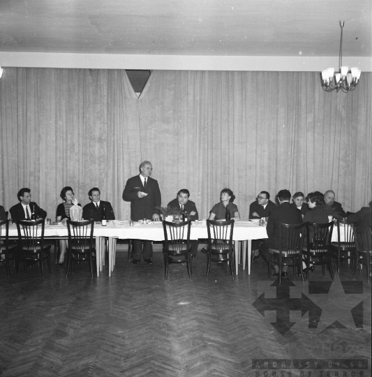 AZONOSÍTÓ: THM-BJ-00717 Férfi beszédet mond - transzparensen felirat: "Munkánk minőségének és hatékonyságának javításával, többletvállalásokkal készülünk a NAGY OKT. SZOC. FORR. 60. évfordulójára". [Az októberi orosz forradalom (kommunista propagandában: nagy októberi szocialista forradalom) 1917. november 6–12. (október 24–30.) között zajlott, amelynek során a bolsevikok a Téli Palota ostroma után az ott székelő Ideiglenes Kormány tagjait letartóztatták, és Lenin vezetésével, akit a Népbiztosok Tanácsa elnökévé választottak, puccsal átvették a hatalmat. Hazánkban ez a nap 1950-től 1989-ig pártállami ünnep volt.] [A szocialista brigádmozgalom szovjet mintára az 1950-es évek végén kezdett kibontakozni Magyarországon, és rendszerváltoztatáskor szűnt meg. Kezdetben csak az ipari üzemekben és gyárakban alakultak meg a brigádok, majd az agráriumban és a hivatali szférában is létrejöttek. A mozgalom jelszava: „Szocialista módon dolgozni, tanulni és élni” volt.] HELYSZÍN: Szekszárd, Tolna megye DÁTUM: 1977 FOTÓS: Bakó Jenő
