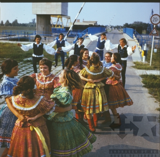 népviselet néptáncos reklám propaganda zsilip híd KRESZ-tábla sorompó Szekszárd Tolna megye Magyarország 1975 Bakó JenőFotó részletei
