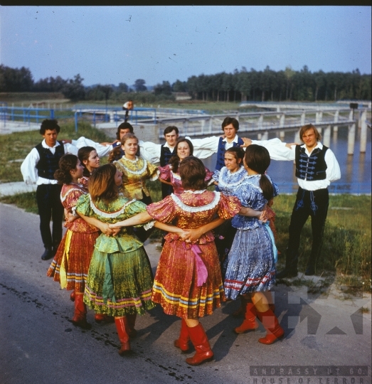 népviselet néptáncos reklám propaganda zsilip Szekszárd Tolna megye Magyarország 1975 Bakó JenőFotó részletei