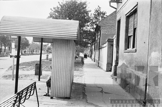 utcakép buszmegálló tábla pad szemetes kuka Szekszárd Tolna megye Magyarország 1979 Bakó JenőFotó részletei