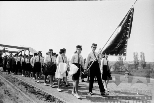 szocialista állami ünnep ifjúsági mozgalmi élet május 1. munka ünnepe felvonulás KISZ egyenruha csapatzászló Simontornya Tolna megye Magyarország 1965 Bakó JenőFotó részletei