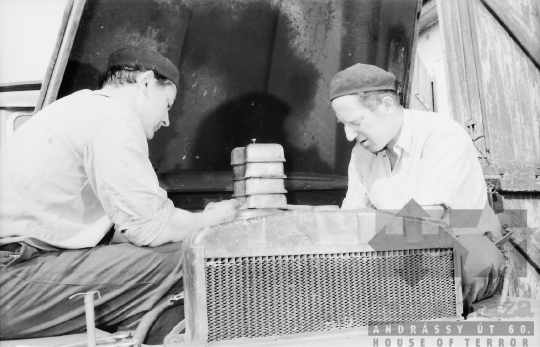 termelőszövetkezet teherautó szerelés műhely svájcisapka Bátaszék Tolna megye Magyarország 1967 Bakó JenőFotó részletei