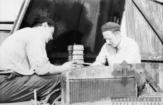 termelőszövetkezet teherautó szerelés műhely svájcisapka Bátaszék Tolna megye Magyarország 1967 Bakó JenőFotó részletei