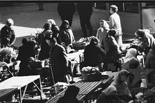 kosár stand virág zöldség kendő parasztasszony tömeg árus kofa piac Szekszárd Tolna megye Magyarország 1967 Bakó JenőFotó részletei