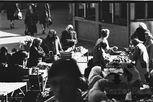 kosár stand virág zöldség kendő parasztasszony tömeg árus kofa piac Szekszárd Tolna megye Magyarország 1967 Bakó JenőFotó részletei