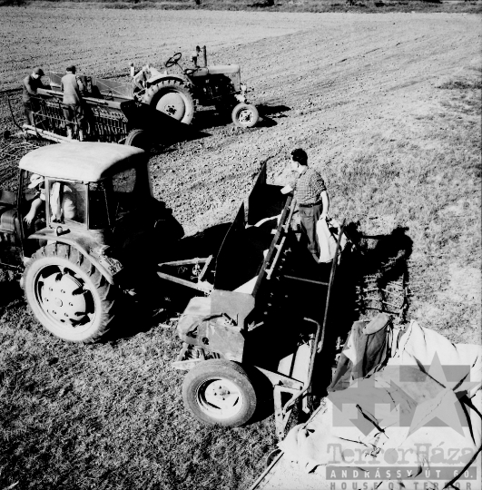 termelőszövetkezet gabona vetés vetőmag traktor zsák vetőgép Nagykónyi Tolna megye Magyarország 1968 Bakó JenőFotó részletei