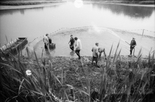 termelőszövetkezet halász halászháló csónak slag halastó halászat Tamási Tolna megye Magyarország 1981 Bakó JenőFotó részletei