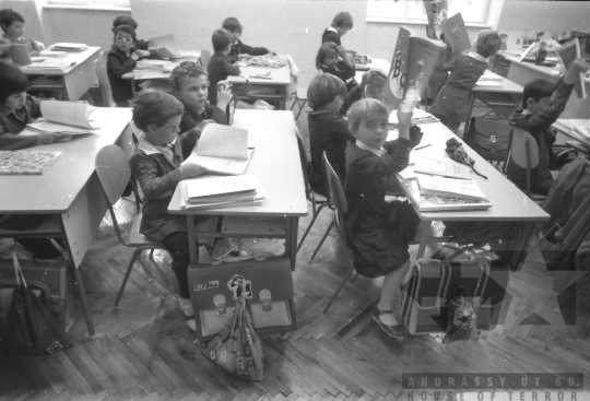 diák iskola általános iskola tanterem köpeny iskolapad iskolatáska Szekszárd Tolna megye Magyarország 1981 Bakó JenőFotó részletei