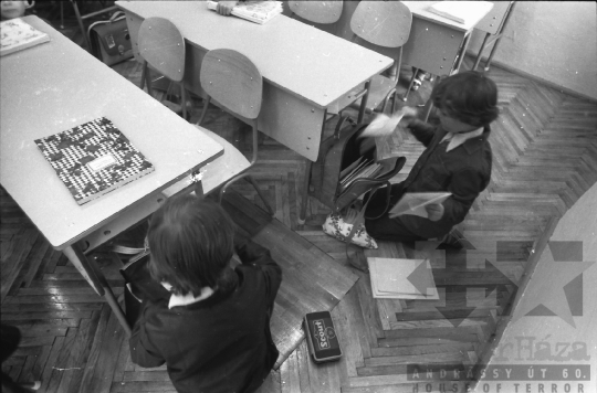 diák iskola általános iskola tanterem köpeny iskolapad iskolatáska Szekszárd Tolna megye Magyarország 1981 Bakó JenőFotó részletei