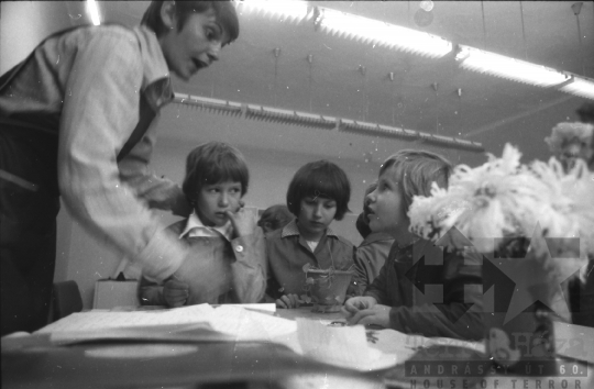 diák iskola általános iskola tanterem köpeny virág Szekszárd Tolna megye Magyarország 1981 Bakó JenőFotó részletei