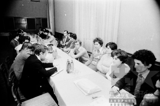 AZONOSÍTÓ: THM-BJ-00716 A rendezvény résztvevői. [A szocialista brigádmozgalom szovjet mintára az 1950-es évek végén kezdett kibontakozni Magyarországon, és rendszerváltoztatáskor szűnt meg. Kezdetben csak az ipari üzemekben és gyárakban alakultak meg a brigádok, majd az agráriumban és a hivatali szférában is létrejöttek. A mozgalom jelszava: „Szocialista módon dolgozni, tanulni és élni” volt.] HELYSZÍN: Szekszárd, Tolna megye DÁTUM: 1977 FOTÓS: Bakó Jenő