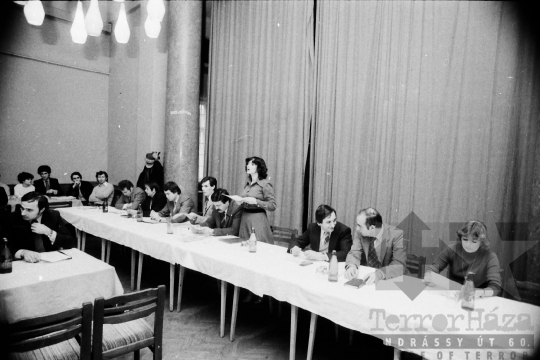 AZONOSÍTÓ: THM-BJ-00716 A rendezvény résztvevői. [A szocialista brigádmozgalom szovjet mintára az 1950-es évek végén kezdett kibontakozni Magyarországon, és rendszerváltoztatáskor szűnt meg. Kezdetben csak az ipari üzemekben és gyárakban alakultak meg a brigádok, majd az agráriumban és a hivatali szférában is létrejöttek. A mozgalom jelszava: „Szocialista módon dolgozni, tanulni és élni” volt.] HELYSZÍN: Szekszárd, Tolna megye DÁTUM: 1977 FOTÓS: Bakó Jenő