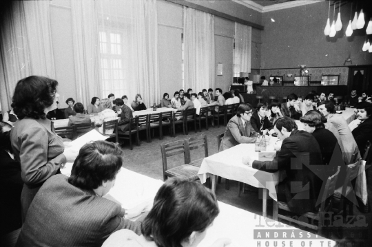 AZONOSÍTÓ: THM-BJ-00716a A rendezvény résztvevői. [A szocialista brigádmozgalom szovjet mintára az 1950-es évek végén kezdett kibontakozni Magyarországon, és rendszerváltoztatáskor szűnt meg. Kezdetben csak az ipari üzemekben és gyárakban alakultak meg a brigádok, majd az agráriumban és a hivatali szférában is létrejöttek. A mozgalom jelszava: „Szocialista módon dolgozni, tanulni és élni” volt.] HELYSZÍN: Szekszárd, Tolna megye DÁTUM: 1977 FOTÓS: Bakó Jenő