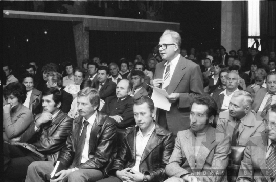 AZONOSÍTÓ: THM-BJ-00714 Férfi beszédet mond. [A szocialista brigádmozgalom szovjet mintára az 1950-es évek végén kezdett kibontakozni Magyarországon, és rendszerváltoztatáskor szűnt meg. Kezdetben csak az ipari üzemekben és gyárakban alakultak meg a brigádok, majd az agráriumban és a hivatali szférában is létrejöttek. A mozgalom jelszava: „Szocialista módon dolgozni, tanulni és élni” volt.] HELYSZÍN: Szekszárd, Tolna megye DÁTUM: 1977 FOTÓS: Bakó Jenő