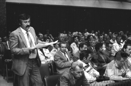 AZONOSÍTÓ: THM-BJ-00714 Férfi beszédet mond. [A szocialista brigádmozgalom szovjet mintára az 1950-es évek végén kezdett kibontakozni Magyarországon, és rendszerváltoztatáskor szűnt meg. Kezdetben csak az ipari üzemekben és gyárakban alakultak meg a brigádok, majd az agráriumban és a hivatali szférában is létrejöttek. A mozgalom jelszava: „Szocialista módon dolgozni, tanulni és élni” volt.] HELYSZÍN: Szekszárd, Tolna megye DÁTUM: 1977 FOTÓS: Bakó Jenő