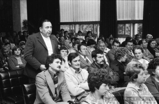 AZONOSÍTÓ: THM-BJ-00714 Férfi beszédet mond. [A szocialista brigádmozgalom szovjet mintára az 1950-es évek végén kezdett kibontakozni Magyarországon, és rendszerváltoztatáskor szűnt meg. Kezdetben csak az ipari üzemekben és gyárakban alakultak meg a brigádok, majd az agráriumban és a hivatali szférában is létrejöttek. A mozgalom jelszava: „Szocialista módon dolgozni, tanulni és élni” volt.] HELYSZÍN: Szekszárd, Tolna megye DÁTUM: 1977 FOTÓS: Bakó Jenő