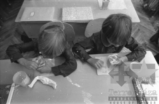 általános iskola napközi iskola diák tízórai dobozos tej pohár iskolapad tanterem Szekszárd Tolna megye Magyarország 1981 Bakó JenőFotó részletei