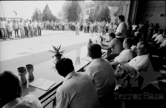 AZONOSÍTÓ: THM-BJ-00717 Férfi beszédet mond - transzparensen felirat: "Munkánk minőségének és hatékonyságának javításával, többletvállalásokkal készülünk a NAGY OKT. SZOC. FORR. 60. évfordulójára". [Az októberi orosz forradalom (kommunista propagandában: nagy októberi szocialista forradalom) 1917. november 6–12. (október 24–30.) között zajlott, amelynek során a bolsevikok a Téli Palota ostroma után az ott székelő Ideiglenes Kormány tagjait letartóztatták, és Lenin vezetésével, akit a Népbiztosok Tanácsa elnökévé választottak, puccsal átvették a hatalmat. Hazánkban ez a nap 1950-től 1989-ig pártállami ünnep volt.] [A szocialista brigádmozgalom szovjet mintára az 1950-es évek végén kezdett kibontakozni Magyarországon, és rendszerváltoztatáskor szűnt meg. Kezdetben csak az ipari üzemekben és gyárakban alakultak meg a brigádok, majd az agráriumban és a hivatali szférában is létrejöttek. A mozgalom jelszava: „Szocialista módon dolgozni, tanulni és élni” volt.] HELYSZÍN: Szekszárd, Tolna megye DÁTUM: 1977 FOTÓS: Bakó Jenő