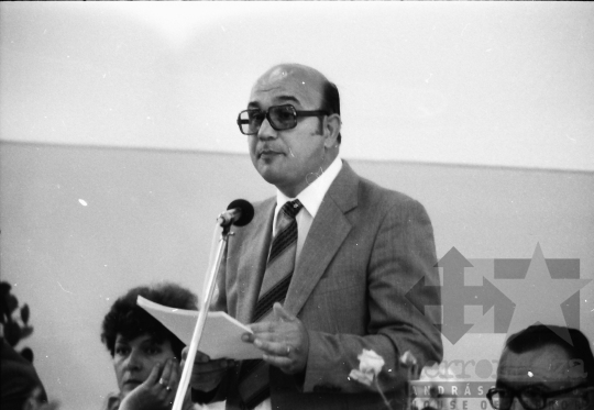 AZONOSÍTÓ: THM-BJ-00714 Férfi beszédet mond. [A szocialista brigádmozgalom szovjet mintára az 1950-es évek végén kezdett kibontakozni Magyarországon, és rendszerváltoztatáskor szűnt meg. Kezdetben csak az ipari üzemekben és gyárakban alakultak meg a brigádok, majd az agráriumban és a hivatali szférában is létrejöttek. A mozgalom jelszava: „Szocialista módon dolgozni, tanulni és élni” volt.] HELYSZÍN: Szekszárd, Tolna megye DÁTUM: 1977 FOTÓS: Bakó Jenő