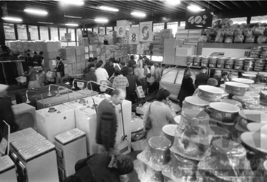 Skála Coop ÁFÉSZ lábas tömeg leértékelés kazán kályha mosdó kosár polc doboz áru áruház Szekszárd Tolna megye Magyarország 1981 Bakó JenőFotó részletei